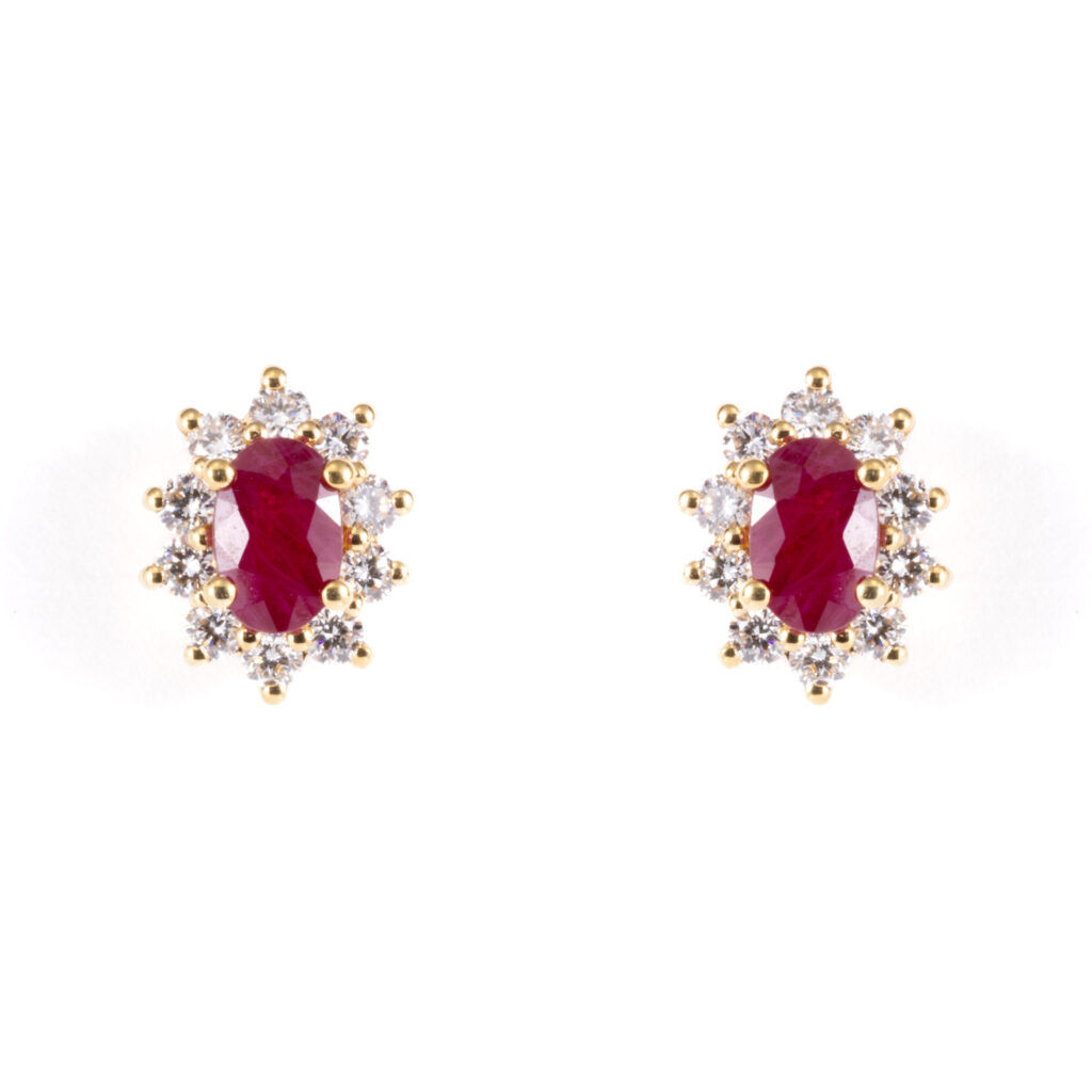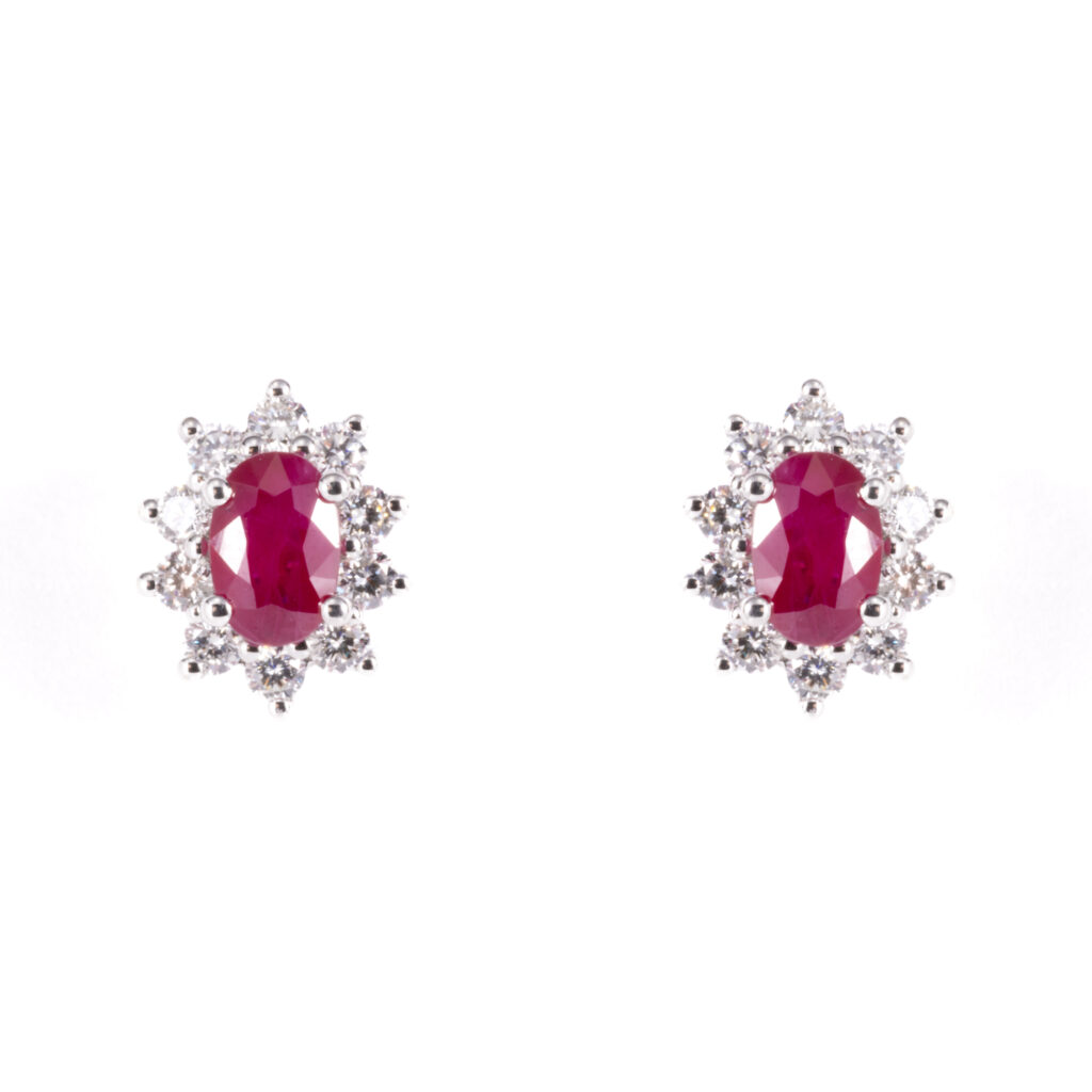 Oval Ruby And Diamonds Cluster Earrings