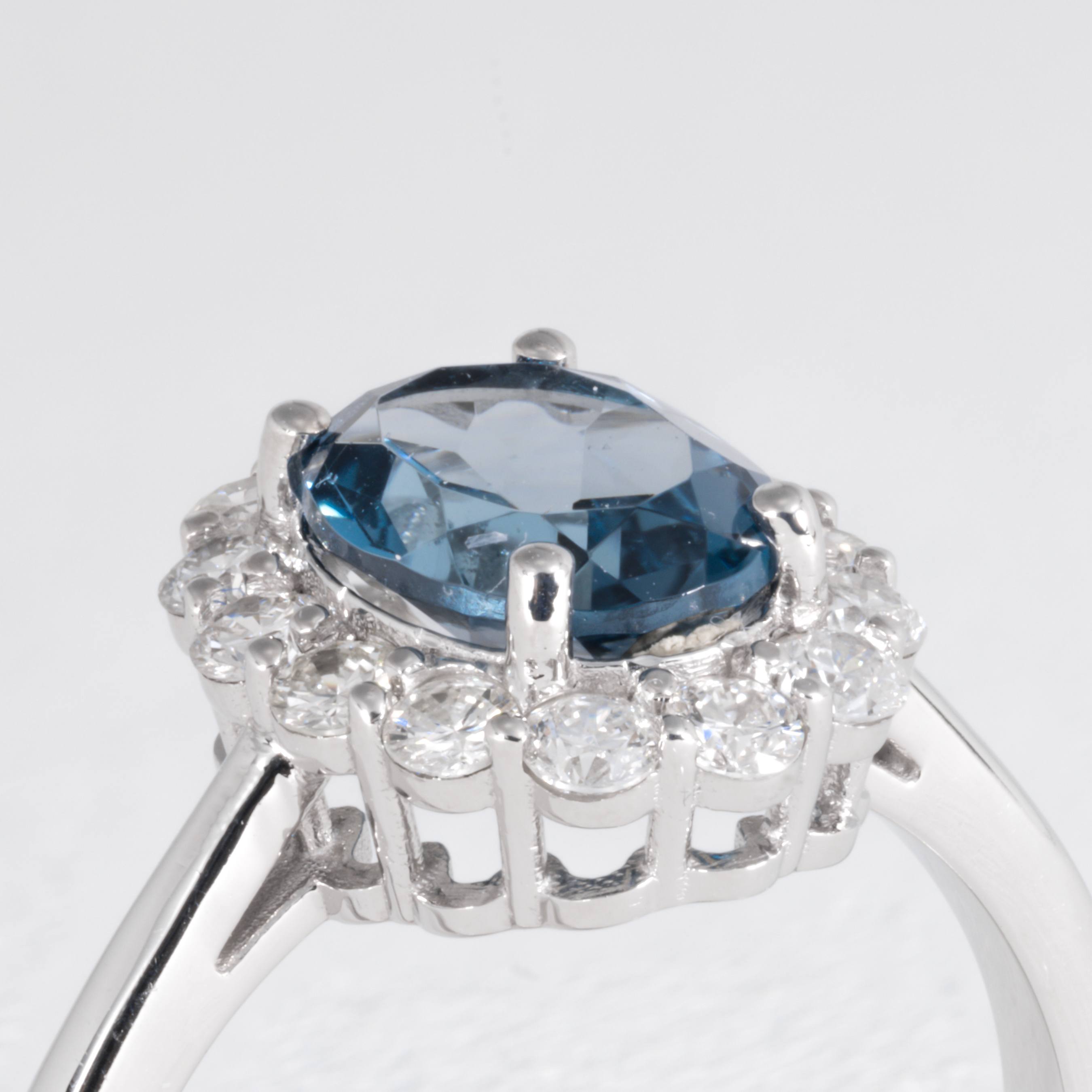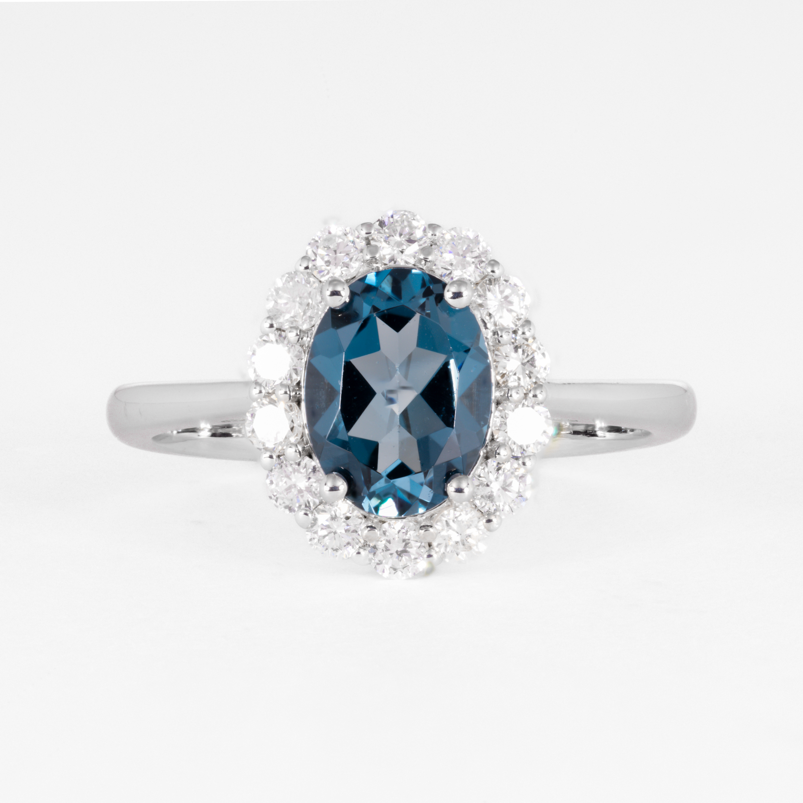 1.60ct London blue topaz with 0.60ct diamond halo set in 10K white gold