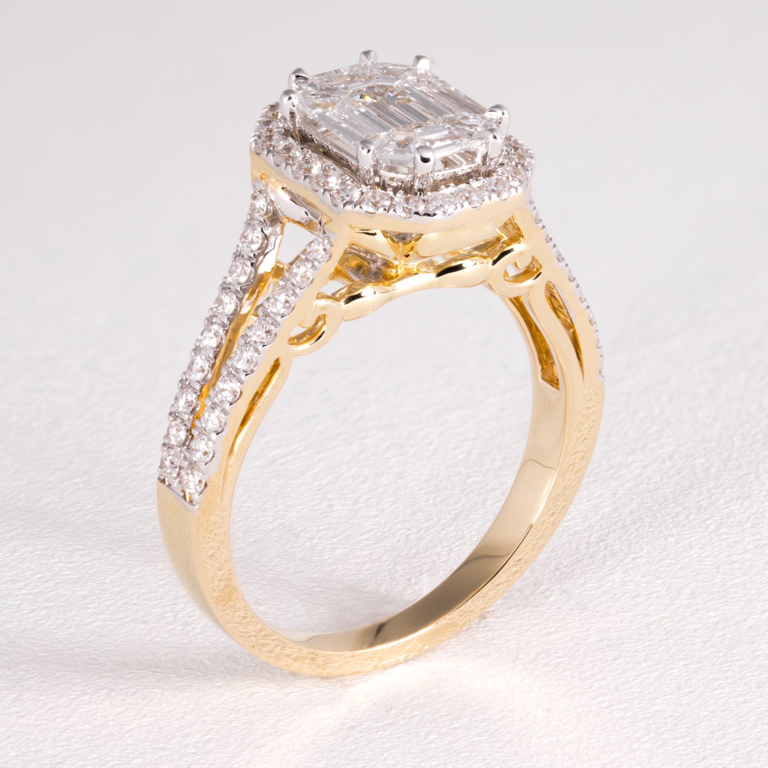 This sophisticated 18K Yellow Gold halo diamond ring creates a striking visual impact. The design is accentuated by 0.59ct of sleek, architectural baguette-cut diamonds and 0.59ct small round diamonds that capture light with a clean, linear brilliance.