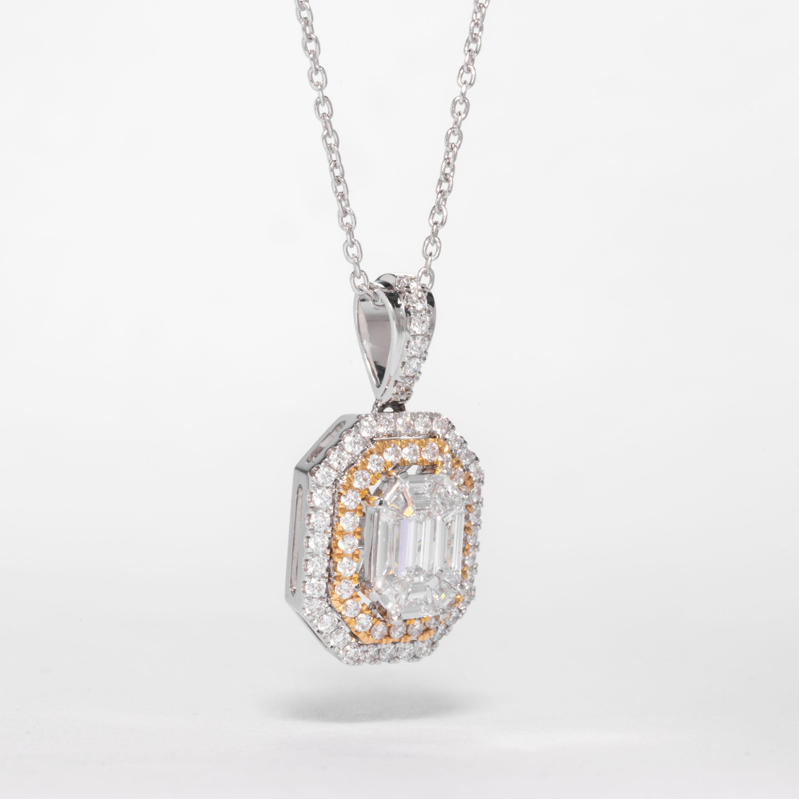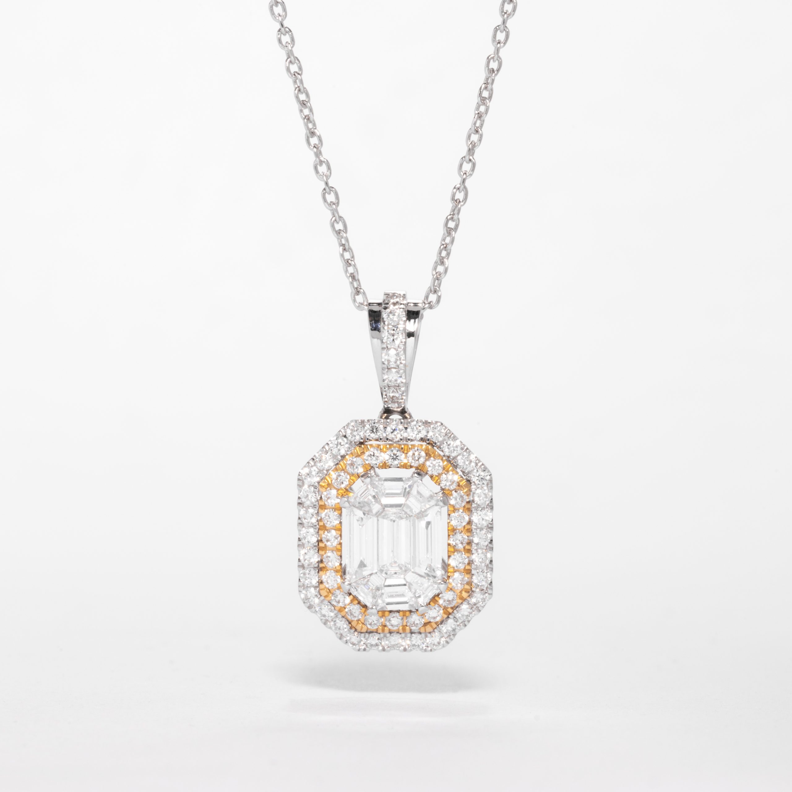 A stunning fusion of metals, this 18K white and rose gold pendant highlights the elegant, step-cut facets of a central emerald-cut diamond. The mixed metal design adds a contemporary edge to a classic and sophisticated stone.