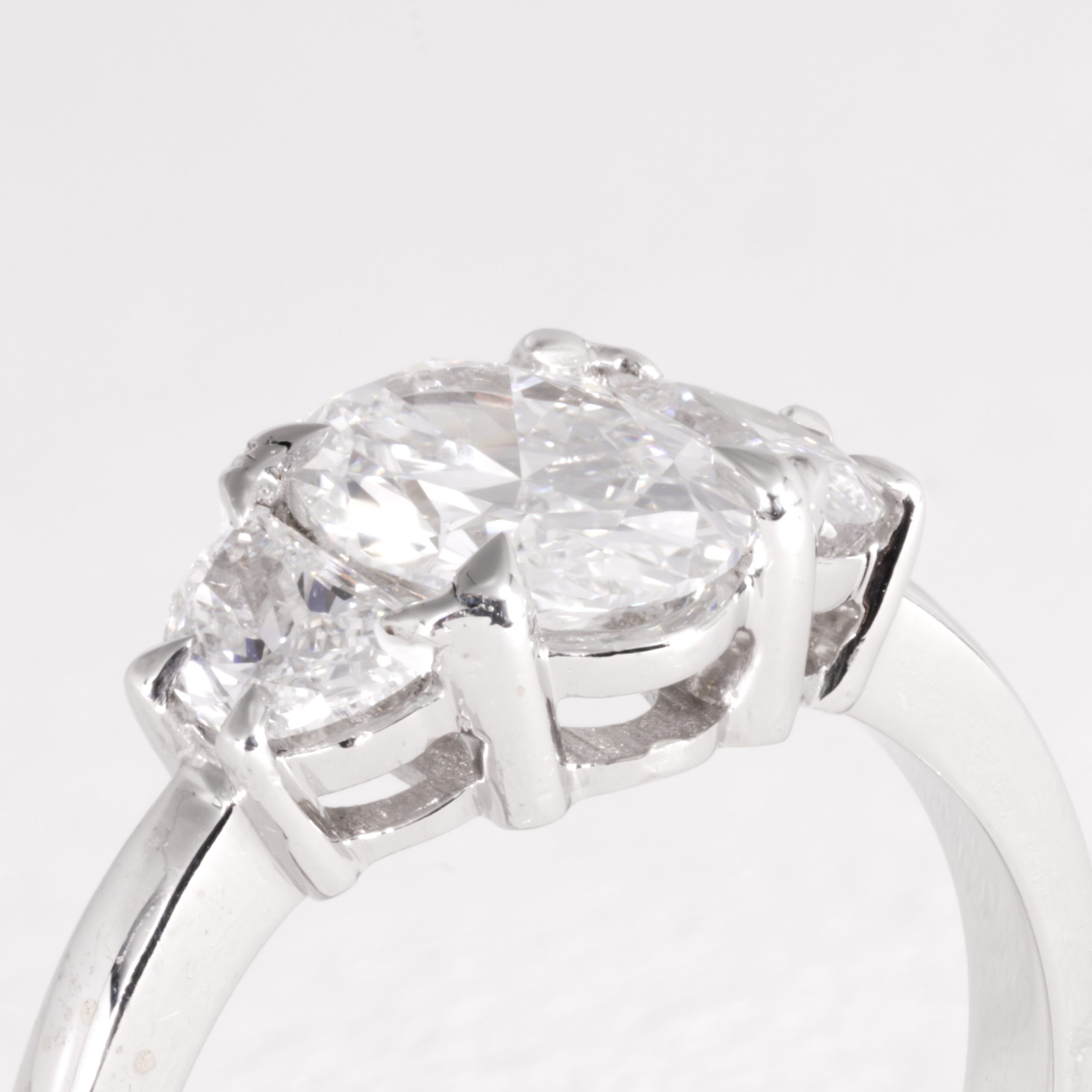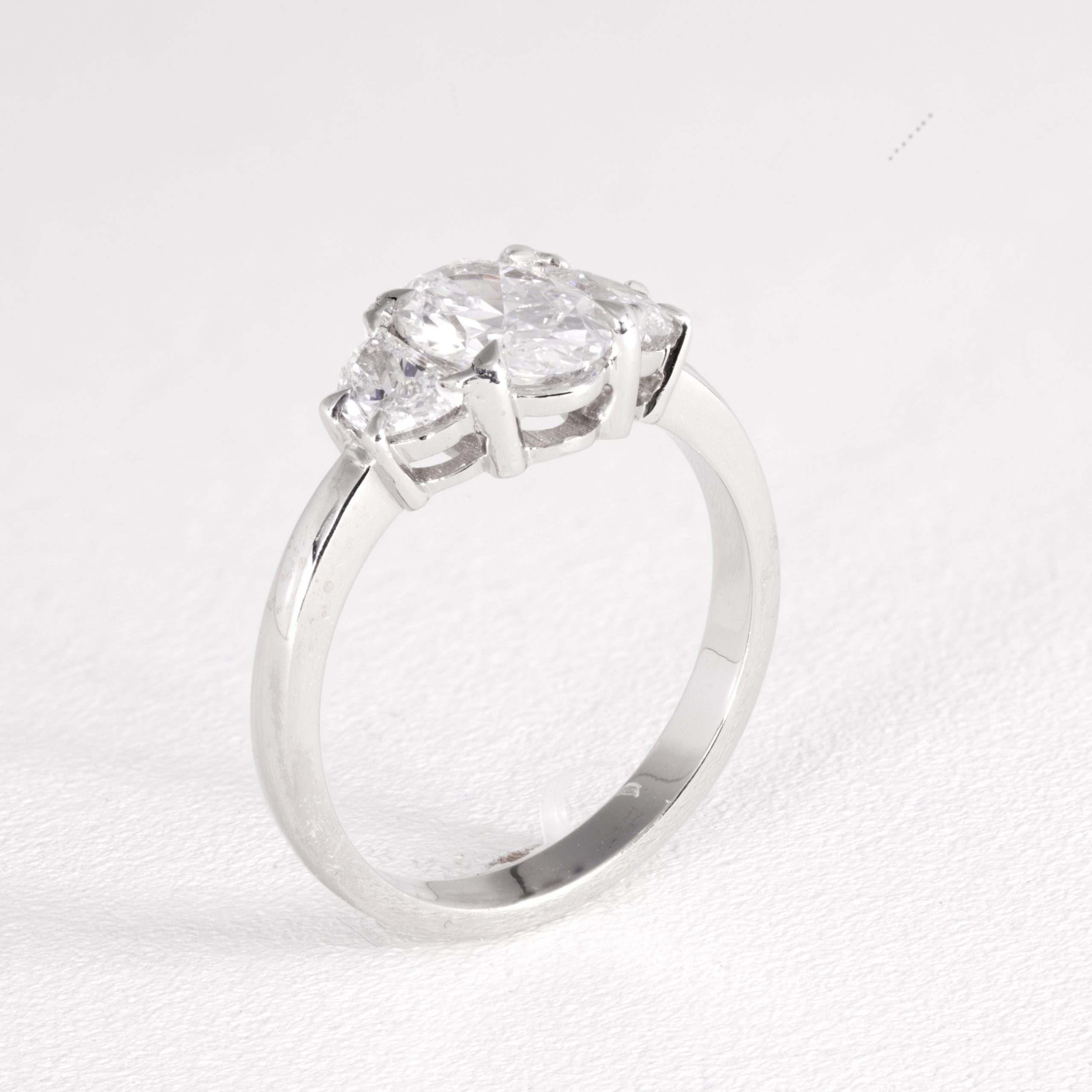 Magnificent 18K white gold trilogy ring features a centre 1ct oval-cut, lab-grown diamonds with a total of 0.41ct of diamonds on the sides, symbolizing your past, present, and future together in a design that is both elongated and elegant. The combination of the classic oval shape and brilliant cut facets ensures maximum sparkle and light performance, creating a breathtaking display of fire and brilliance that gracefully flatters the wearer’s hand.