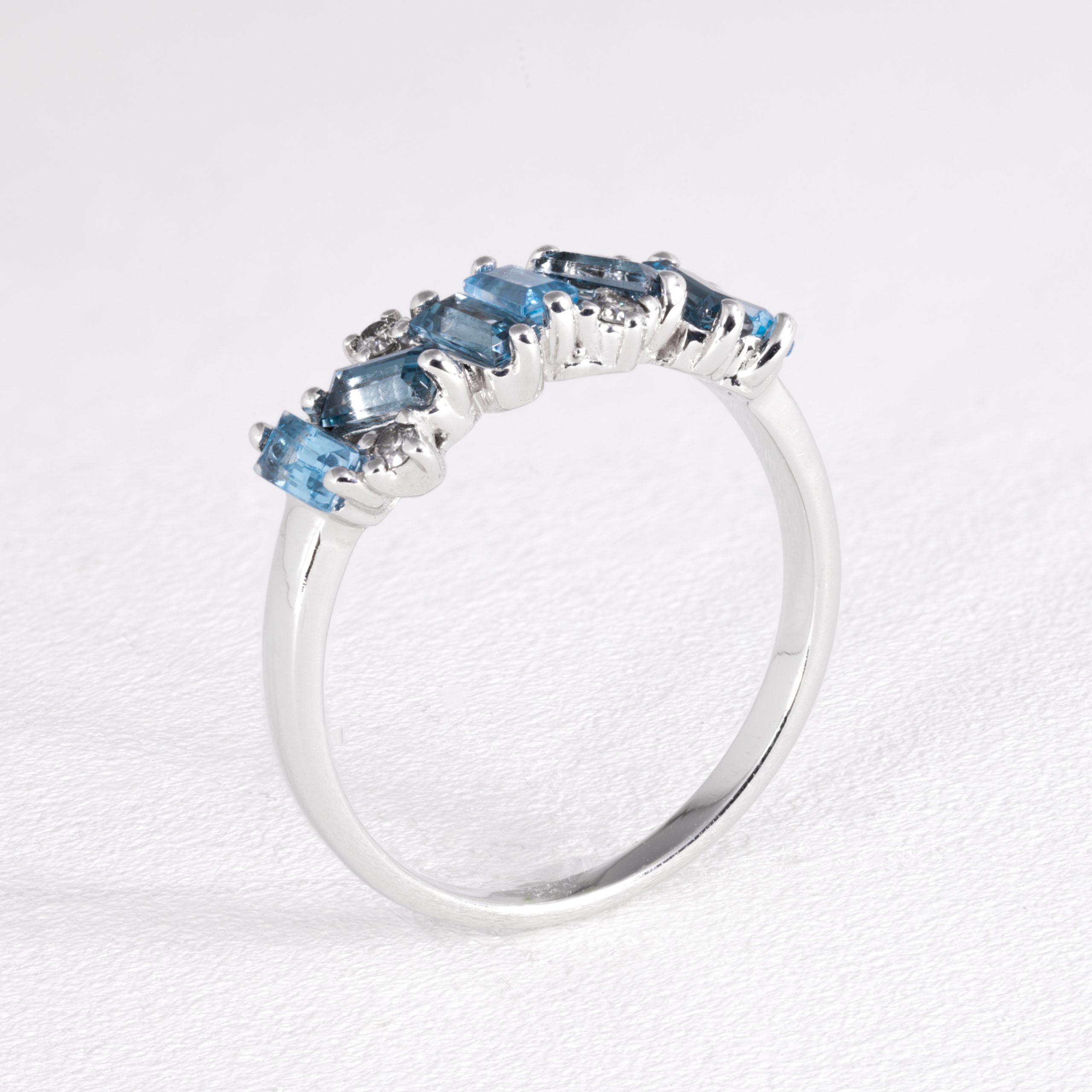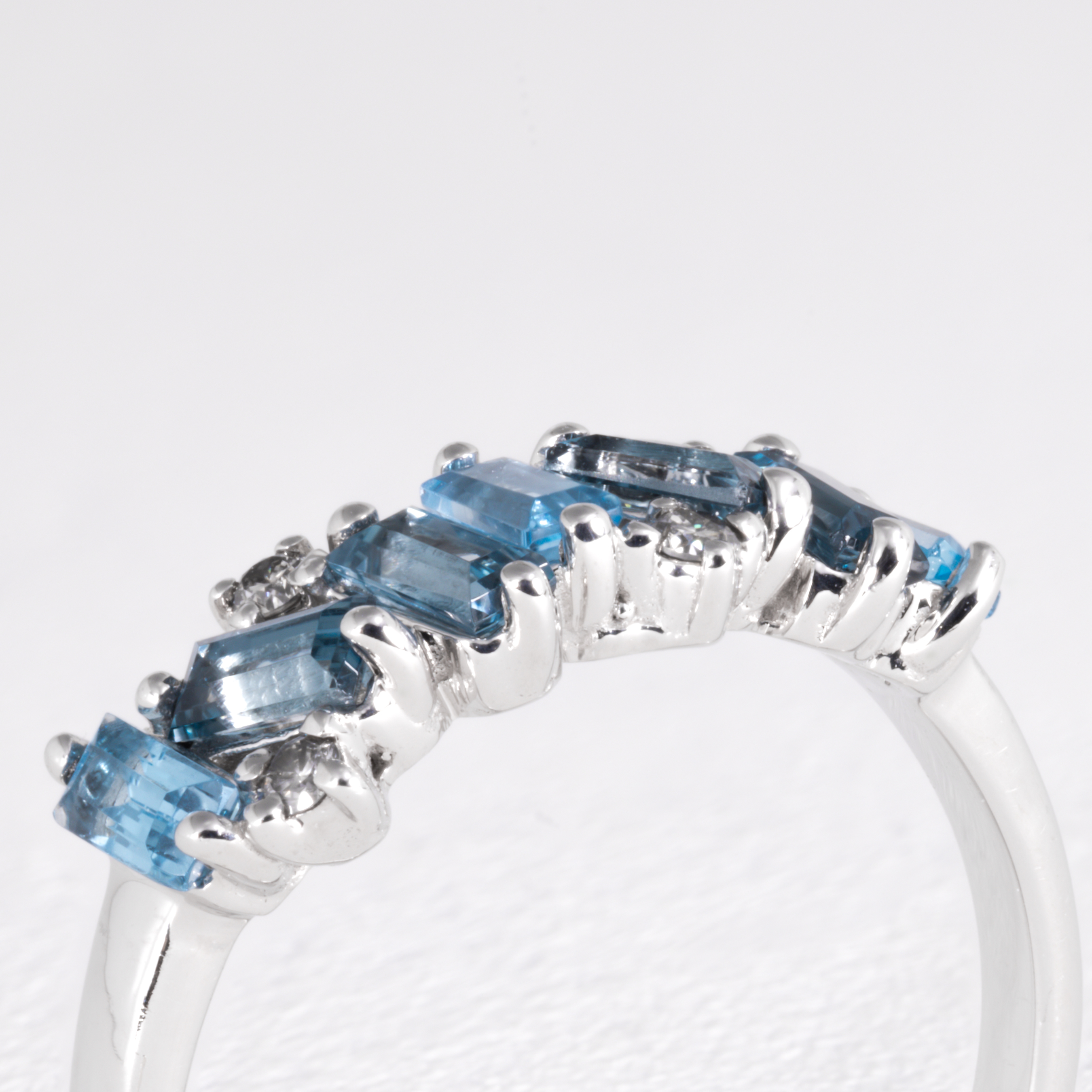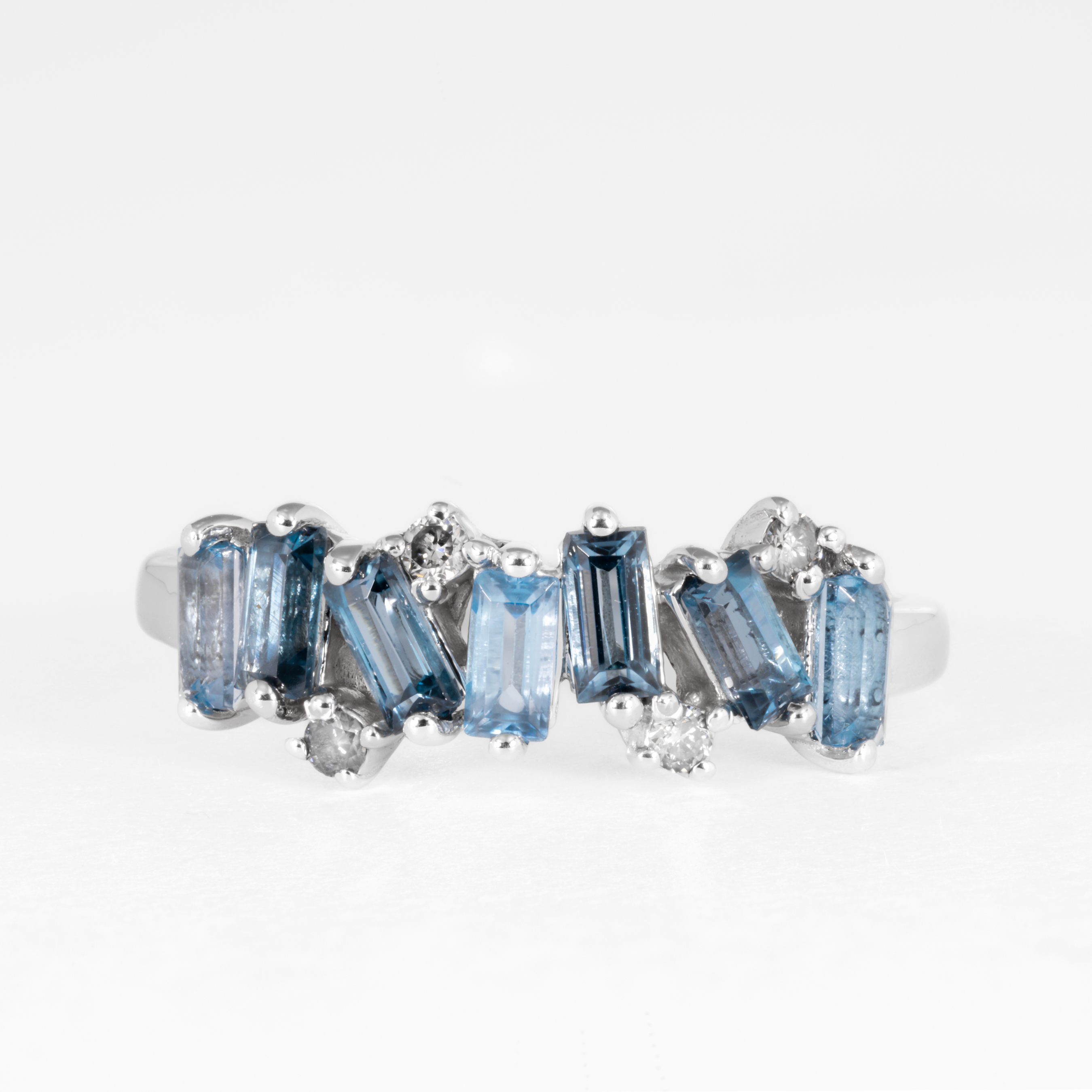 This unique and vibrant eternity ring, crafted in 9K white gold, offers a captivating blend of deep blue sapphires and rich purple amethysts, interspersed with small, sparkling diamonds. The combination of the sleek baguette cuts and the continuous band design creates a modern, colourful piece that symbolises everlasting love and individuality.