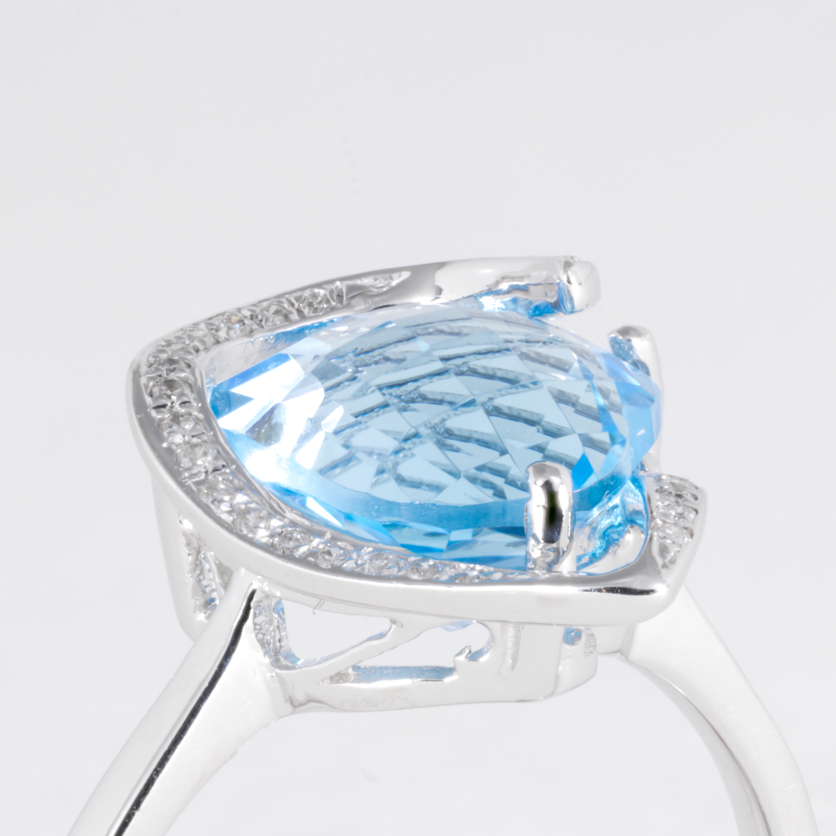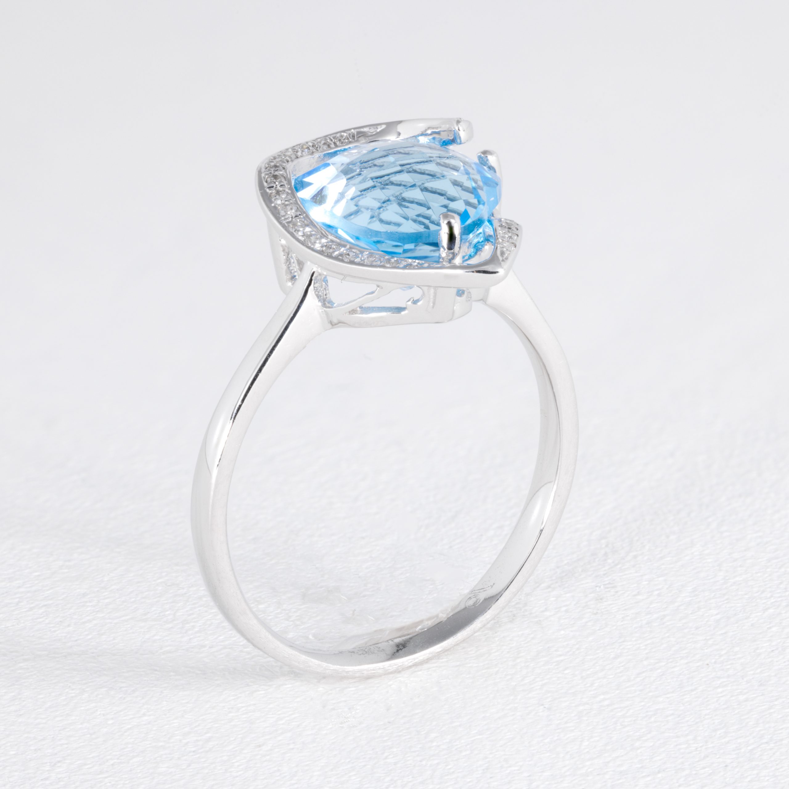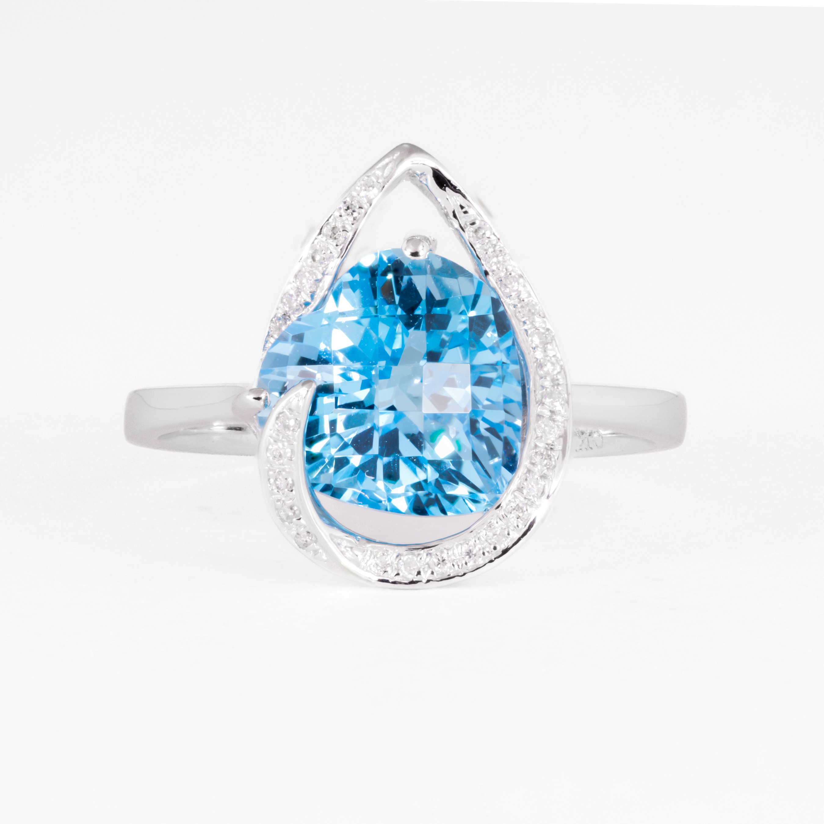 This romantic 9K white gold ring features a stunning heart-shaped blue topaz centre stone, offering a vibrant pop of colour. The central gem is beautifully framed by a halo of sparkling diamonds, adding brilliant contrast and a touch of classic luxury.
